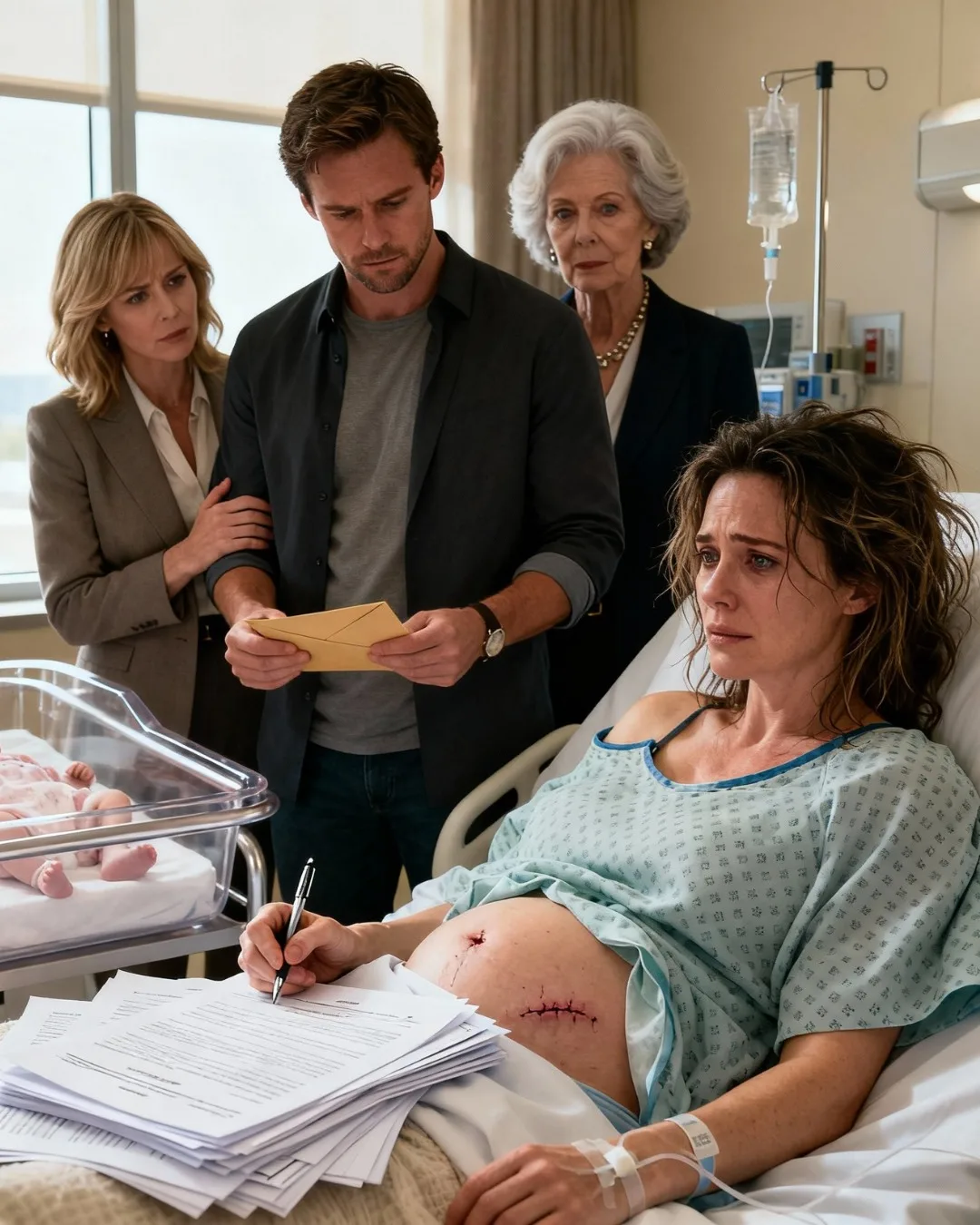 Minutos depois de dar à luz, eu assinava documentos que mal conseguia ler, enquanto uma enfermeira ajustava o soro e fingia não ver minhas mãos tremendo.