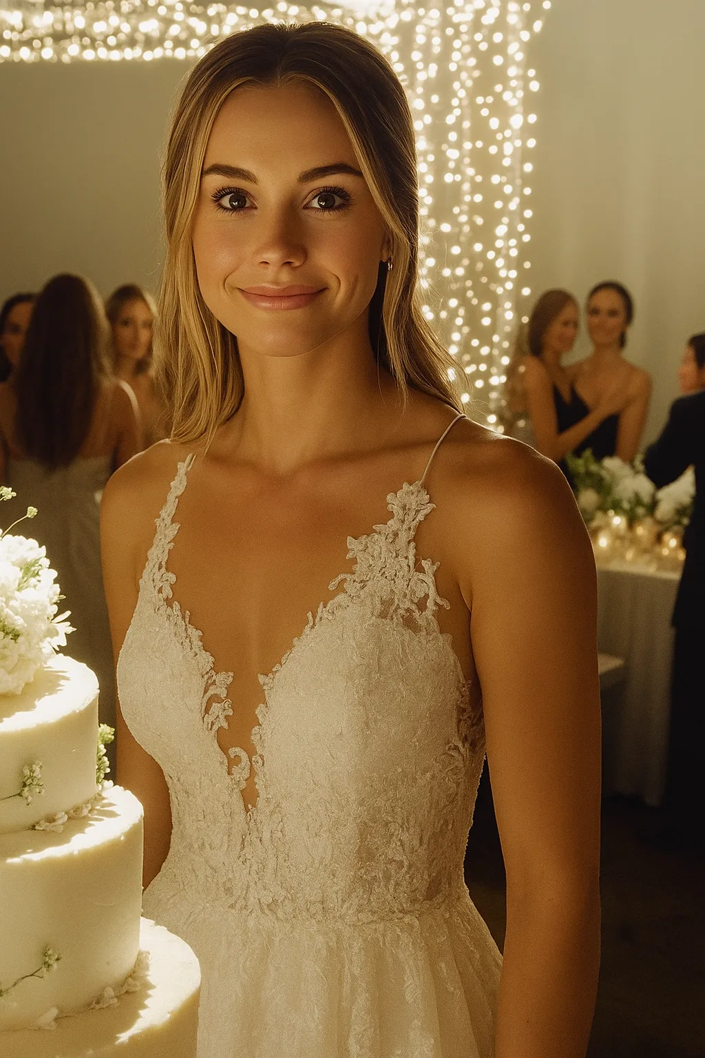 Ela estava deslumbrante em seu vestido branco, mas havia algo diferente nela. Um ar de calma firme, como quem já sabia exatamente o que estava por vir.
