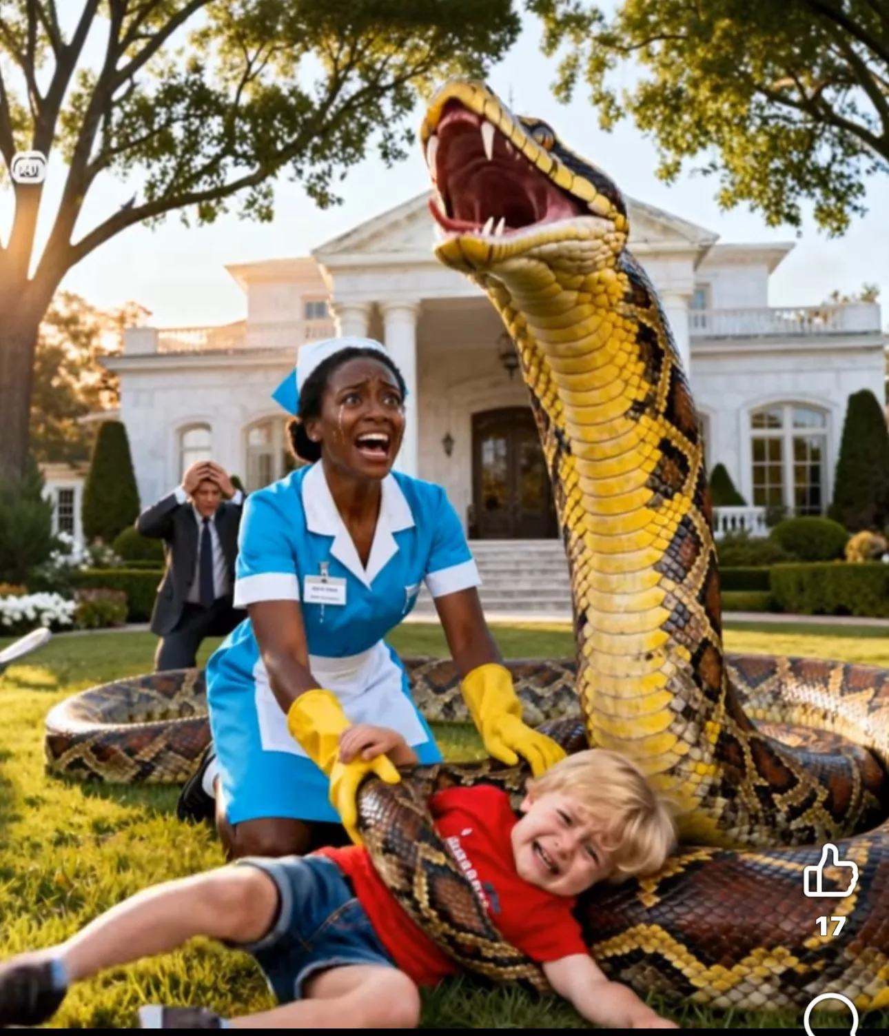 A empregada caiu de joelhos na grama, avançou sem pensar duas vezes e agarrou a cobra com as mãos nuas, colocando-se entre o animal e o menino, mesmo sabendo que poderia ser a próxima vítima.