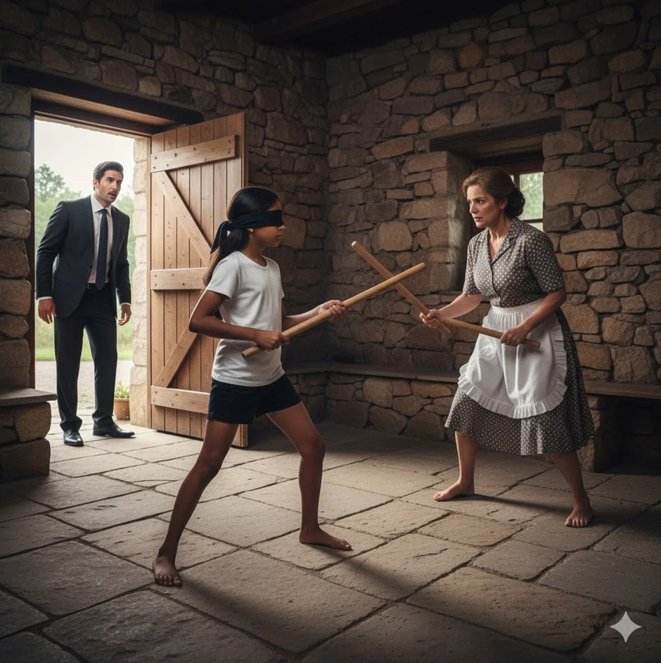 O cabo da vassoura em suas mãos cortava o ar. Valentina não se esquivou. Não chamou o pai. Avançou com passos decididos, levantou seu próprio bastão e bloqueou o golpe com precisão quase matemática, fazendo Fausto tremer.